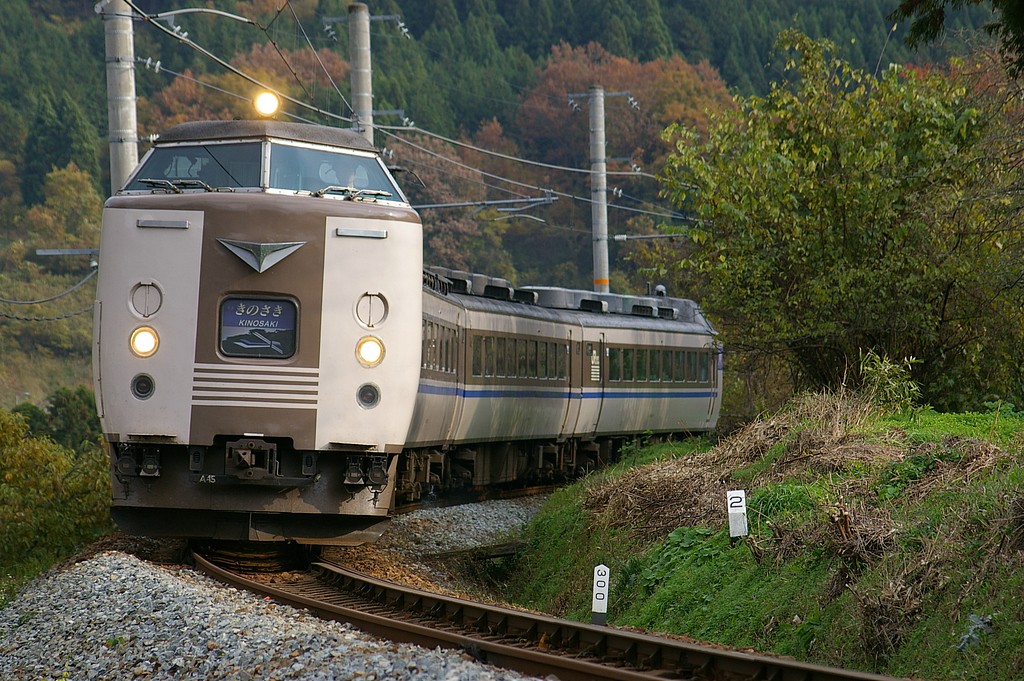 2006.11.25 183系きのさき PENTAX *ist DL2 + SIGMA 70-300mm F4-5.6 DG MACRO ISO 200、1/400、F5.6、35mm換算200mm 単線区間をアウトカーブから狙うポイントです。 道の駅「和」から、細い坂道を上ったところにある踏切付近です。 列車本数は、上下ともに普通列車と特急がともに1時間に1本程度です。 駐車スペース:道の駅に広い駐車場があります。