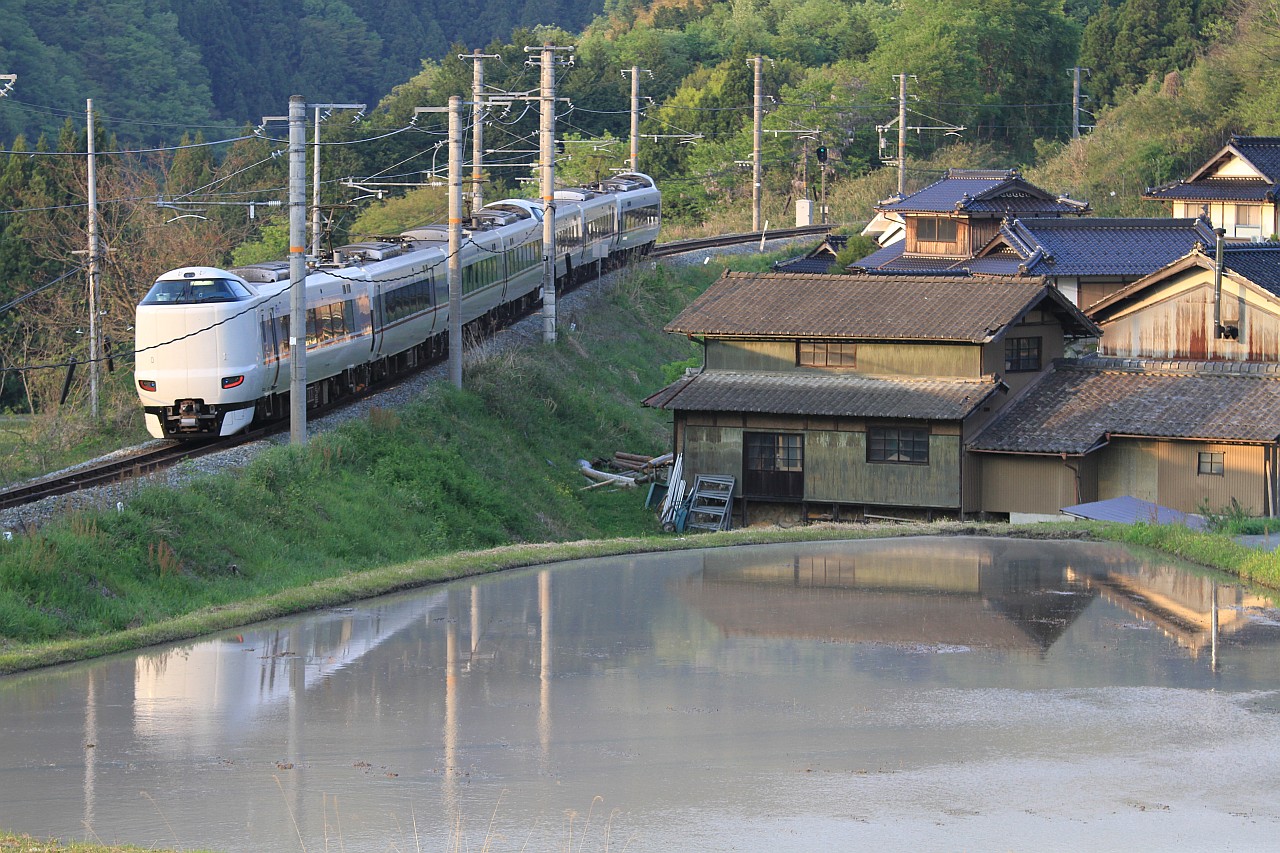 田んぼの水面に、民家と列車を映りこませられました。