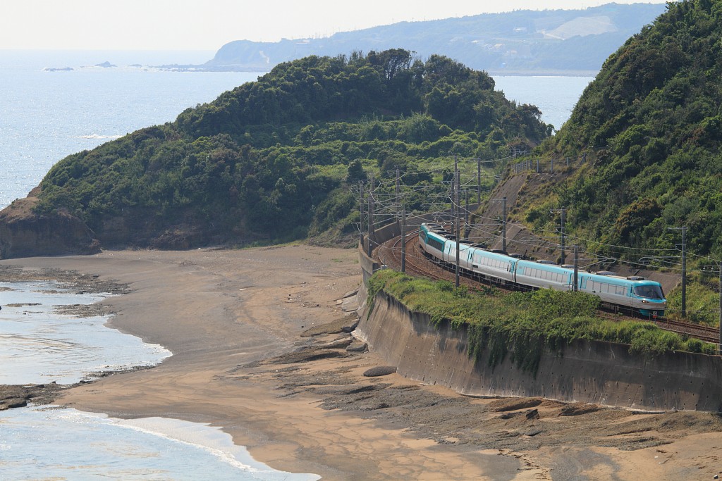その駐車場の奥にあるお立ち台(展望台?)に昇ると海と線路が見えます。