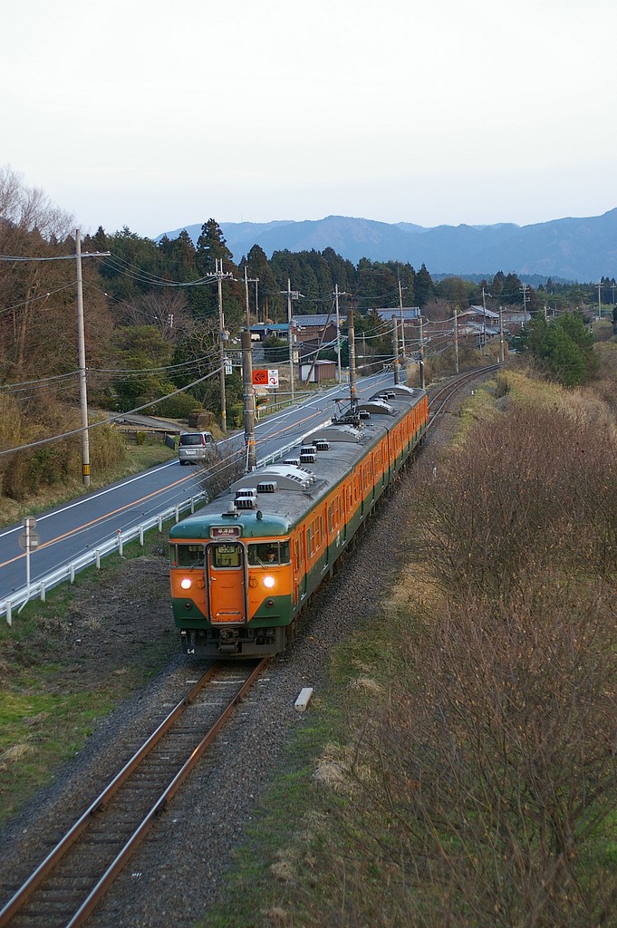 列車本数:1時間に1~2往復程度です。色違いの113系と117系が走っています。