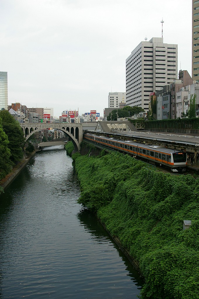 有名な御茶ノ水の風景です。 お茶の水橋から見た、御茶ノ水駅に停車中の列車と神田川の組み合わせ。