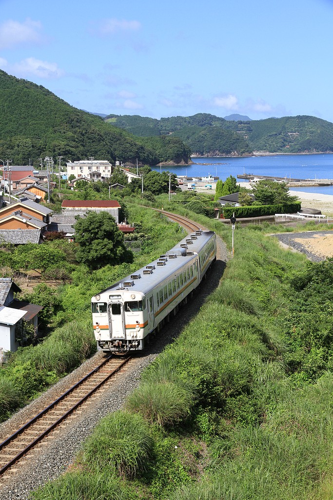 跨線橋のあたりから、海や集落を入れて撮影することができます。