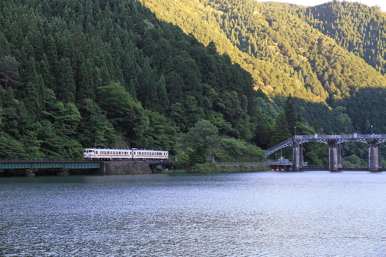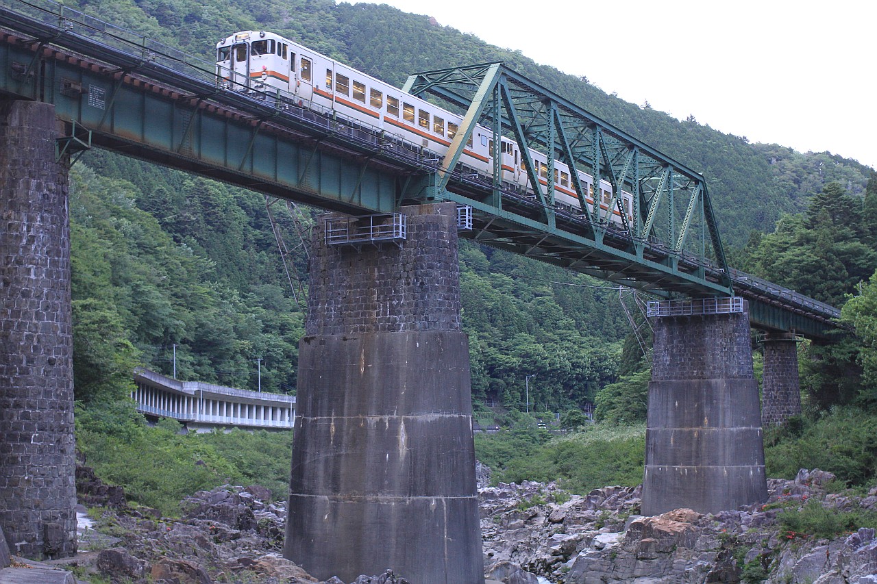 山に囲まれた飛騨川の鉄橋を渡る列車です。