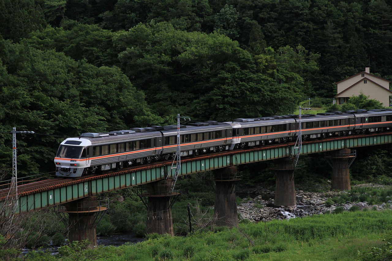 緑の中の鉄橋を行く列車です。