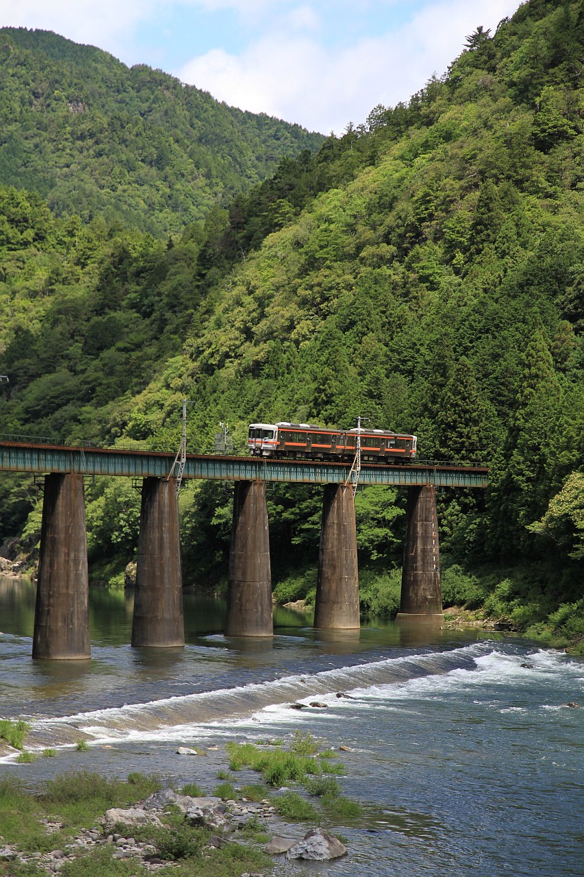 山に囲まれた飛騨川の鉄橋を渡る列車です。