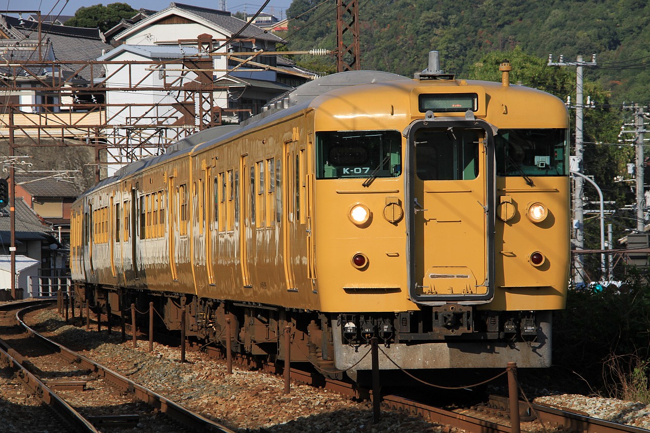 2012.10.20 115系 Canon EOS 7D + Sigma 18-200mm F3.5-6.3 DC OS ISO 200、1/500、F10、35mm換算214mm 尾道の線路脇の路地からの撮影です。 障害物も少なくて狙いやすいポイントです。 列車本数:頻繁にやってきます。 駐車スペース:不明