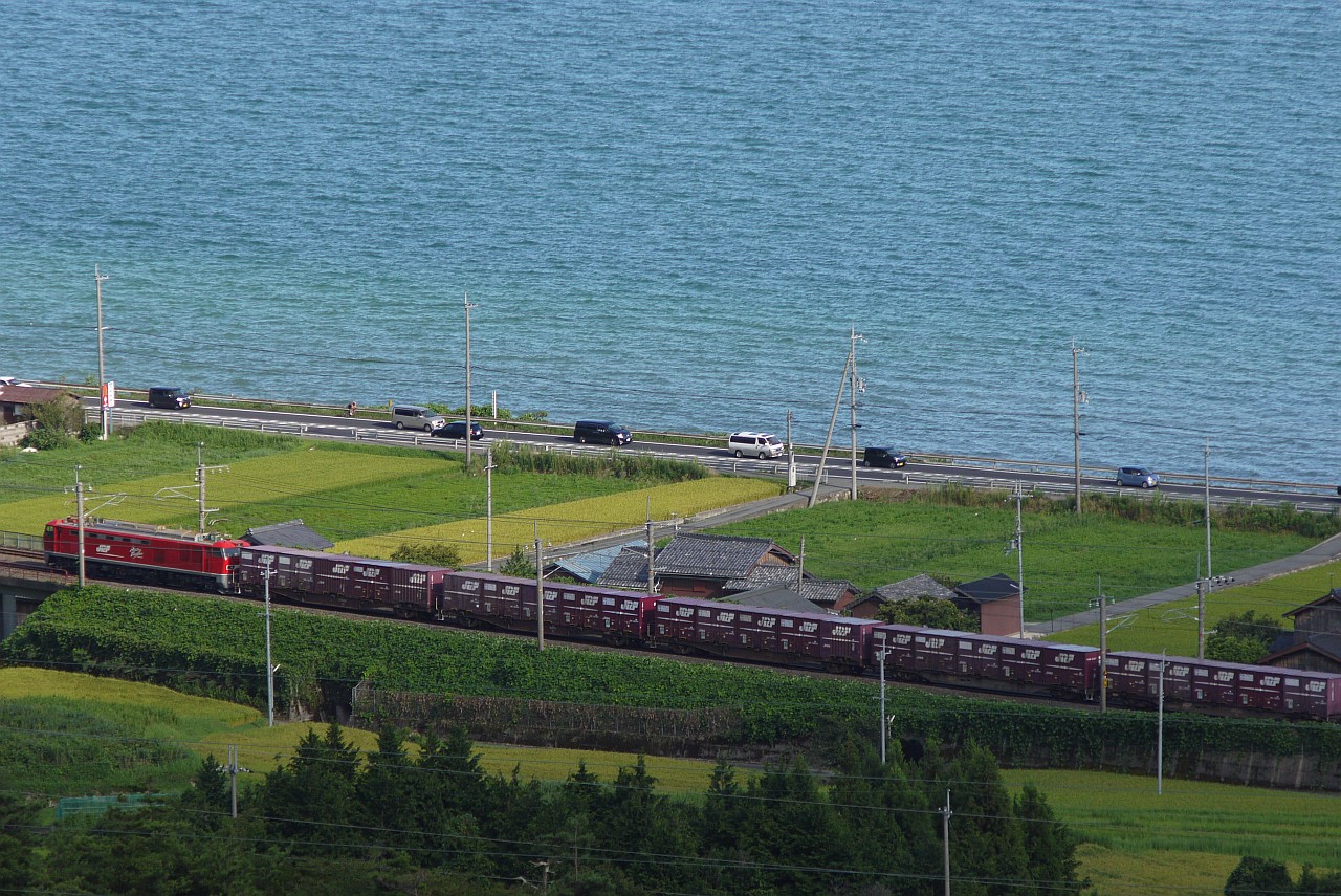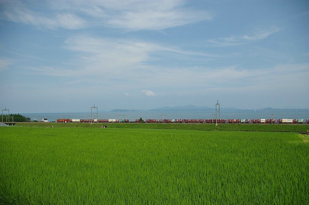 田園風景の中の見通しの良い直線区間が続くため、長い貨物列車でも十分入ります。
