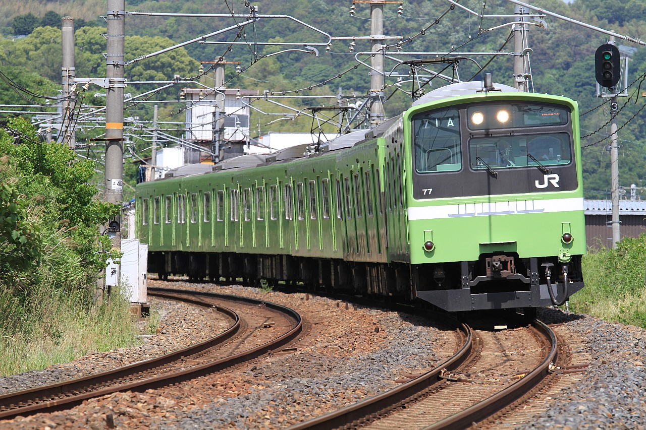 山あいのカーブ区間を行く列車を踏み切り脇から狙います。