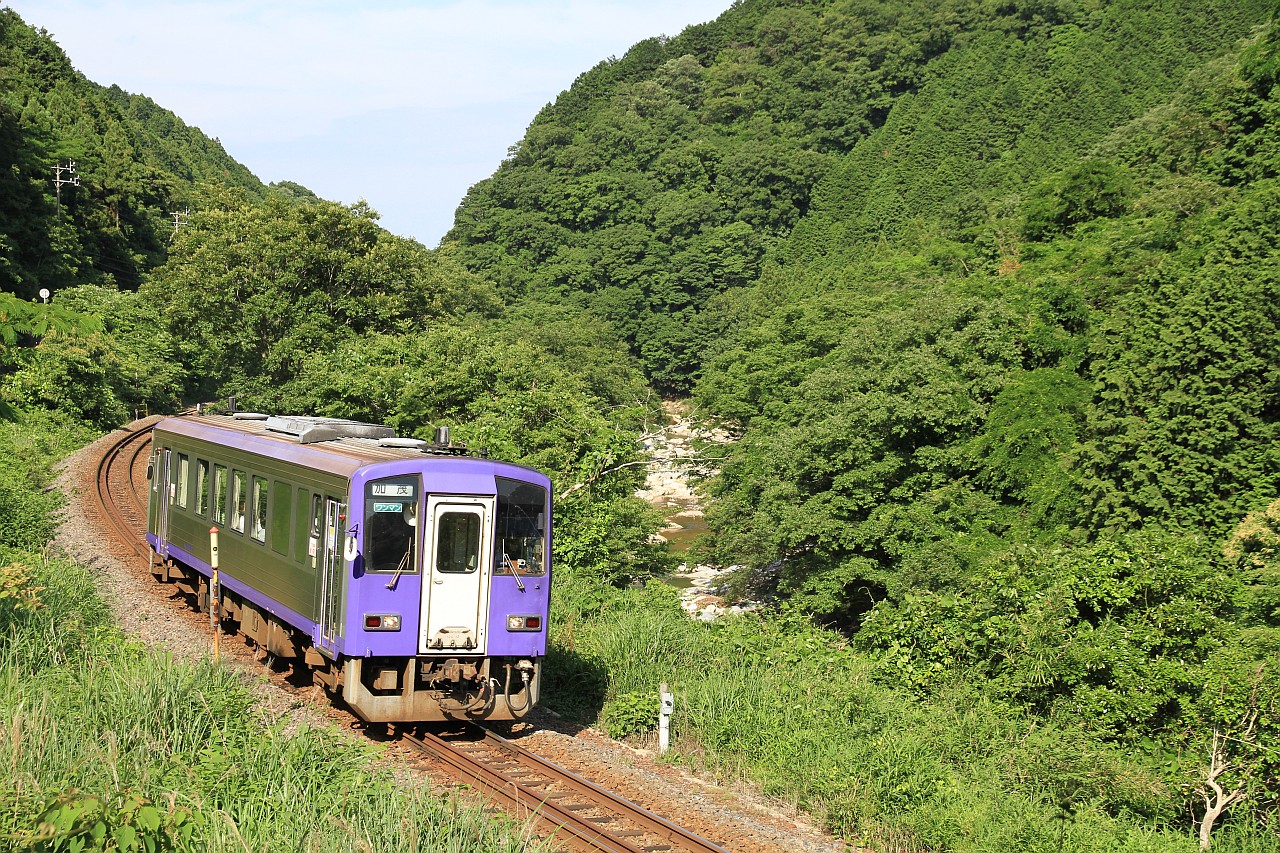 列車本数:上下ともに1時間に1本、キハ120が1~2両で走っています。