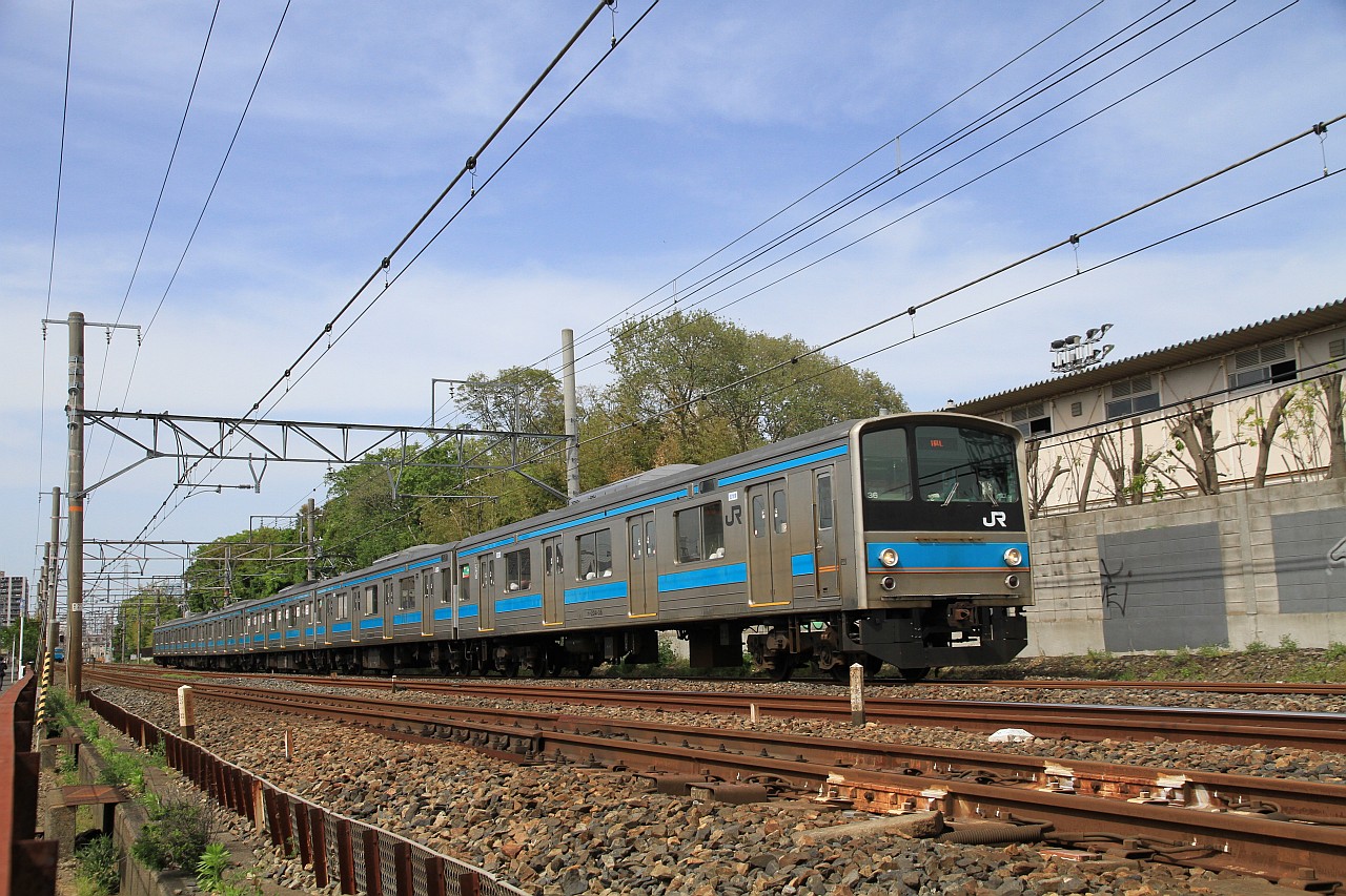 線路沿いの道路から、広角レンズで編成全体を狙うことができます。